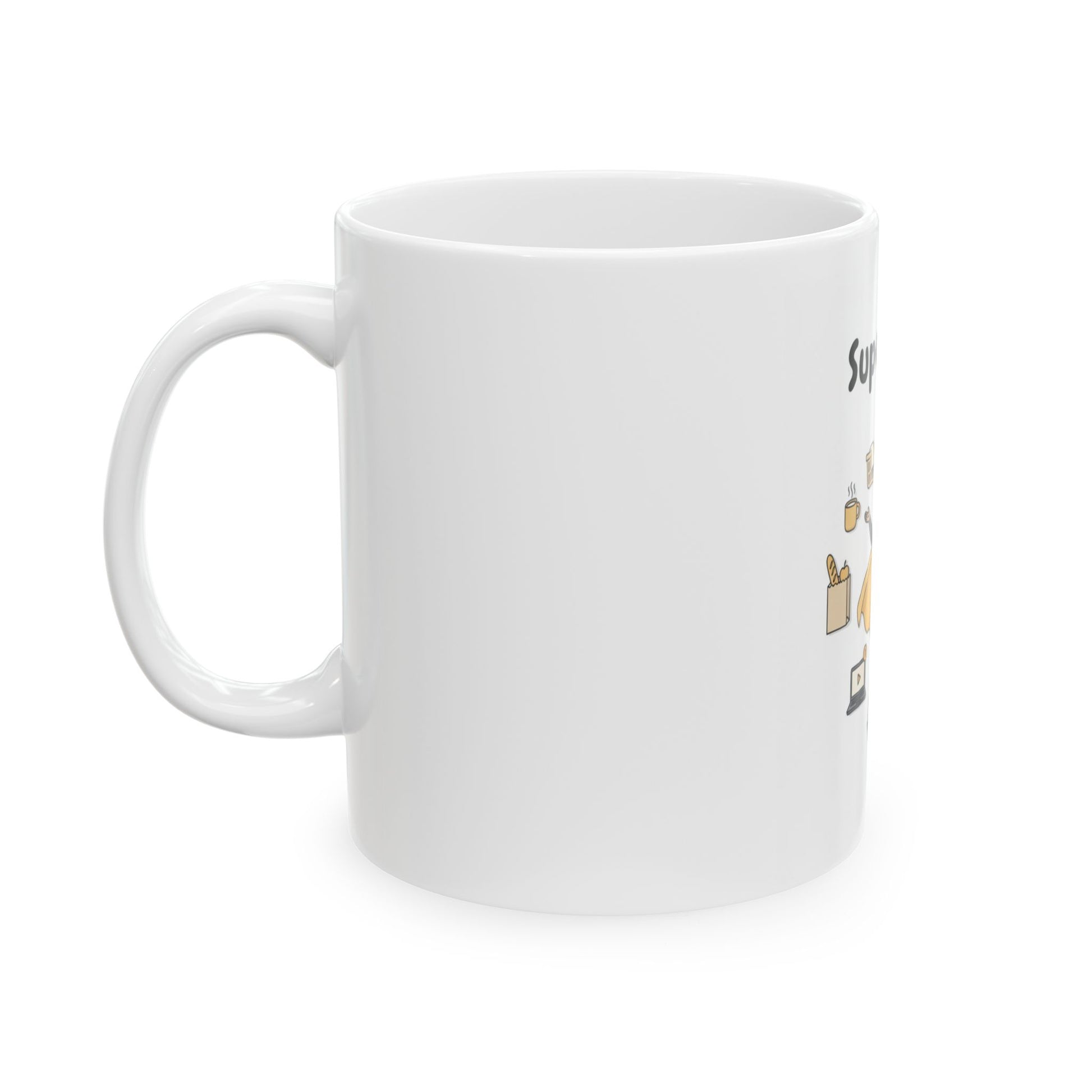 A glossy ceramic mug celebrating the everyday superhero in your life. The cheerful illustration shows a caped ‘Super Mum’ juggling bottles, snacks, a laptop, and a clock — a warm, playful nod to busy mornings, late-night cuddles, and the small victories that make parenting feel heroic. Sip coffee or tea from a bright, durable mug that brings a smile to the sink and the kitchen counter. Its vibrant print stays crisp against the white ceramic, and the comfortable C-handle fits naturally whether you grab an 11oz cup for a quick espresso or a larger 15oz for a long, slow refill.